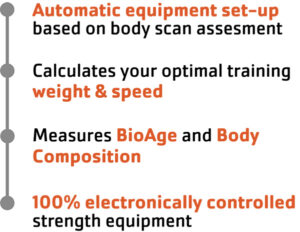 The EGYM Smart Circuit automatically adjusts to your body while guiding you through a custom 20-minute workout, tracking your progress along the way.